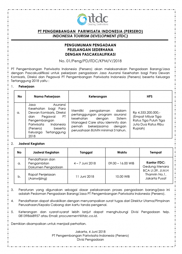 ANNOUNCEMENT OF PROCUREMENT OF SIMPLE AUCTION WITH POST-QUALIFICATION No. 01 / Peng / PD / ITDC / KPM / V / 2018