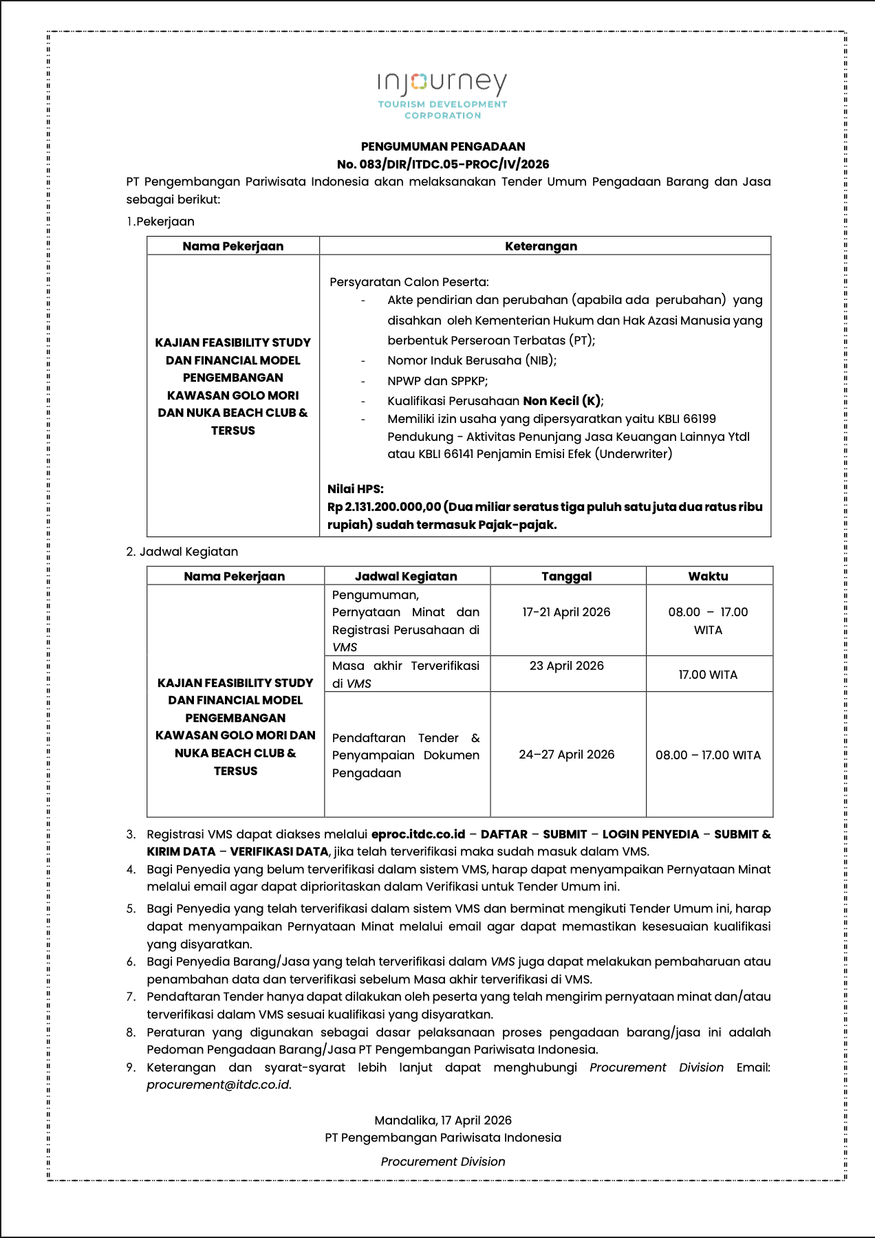 No. 083/DIR/ITDC.05-PROC/IV/2026