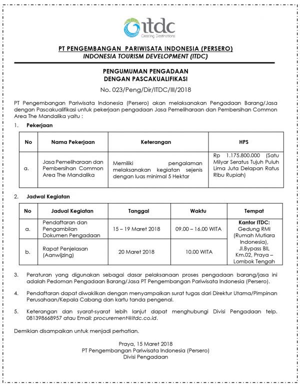 ANNOUNCEMENT OF PROCUREMENT WITH POST-QUALIFICATION No. 023 / Peng / Dir / ITDC / III / 2018