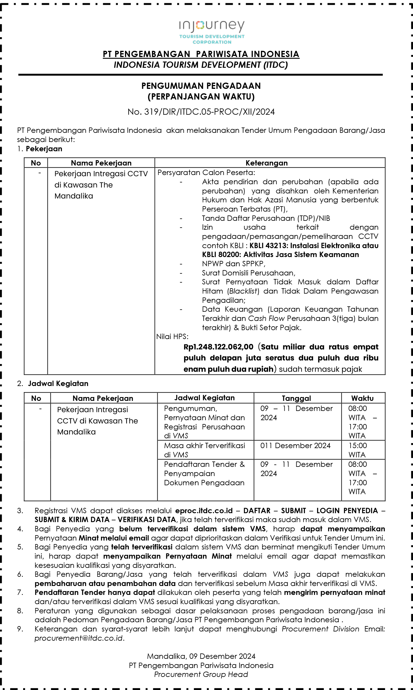 PENGUMUMAN PENGADAAN No 313/DIR/ITDC.05-PROC/XI/2024
