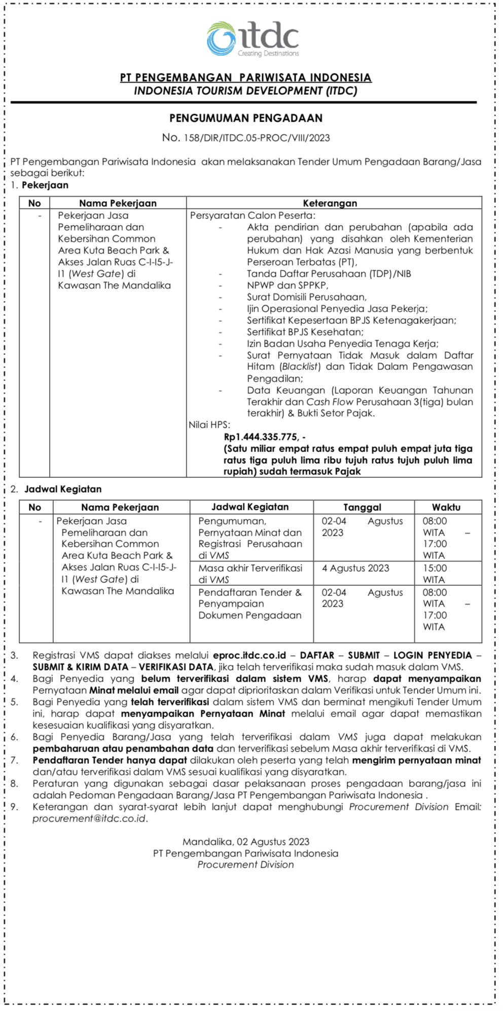 PENGUMUMAN PENGADAAN No. 158/DIR/ITDC.05-PROC/VIII/2023