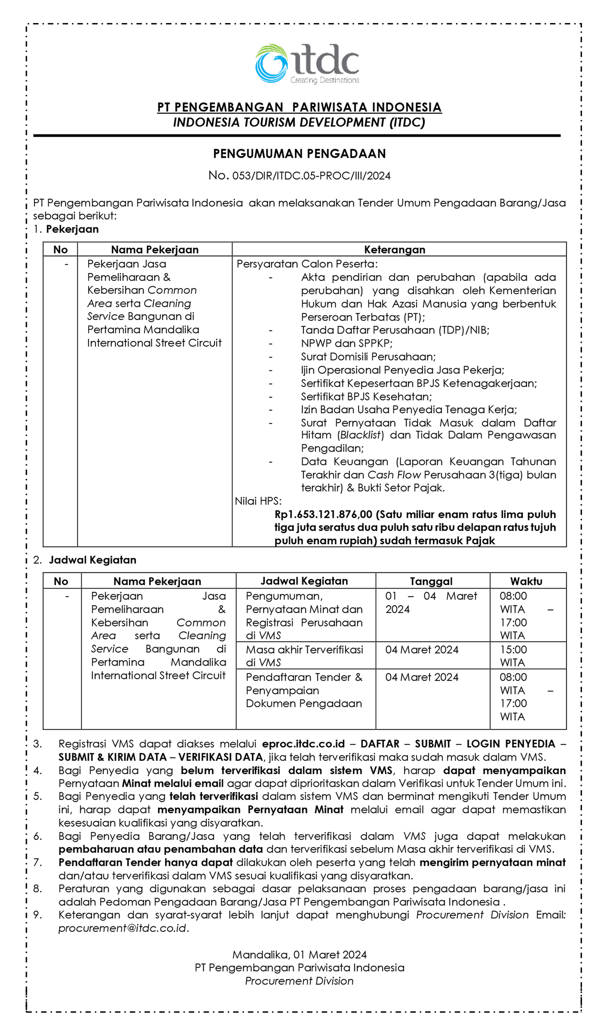 PENGUMUMAN PENGADAAN No. 053/DIR/ITDC.05-PROC/III/2024