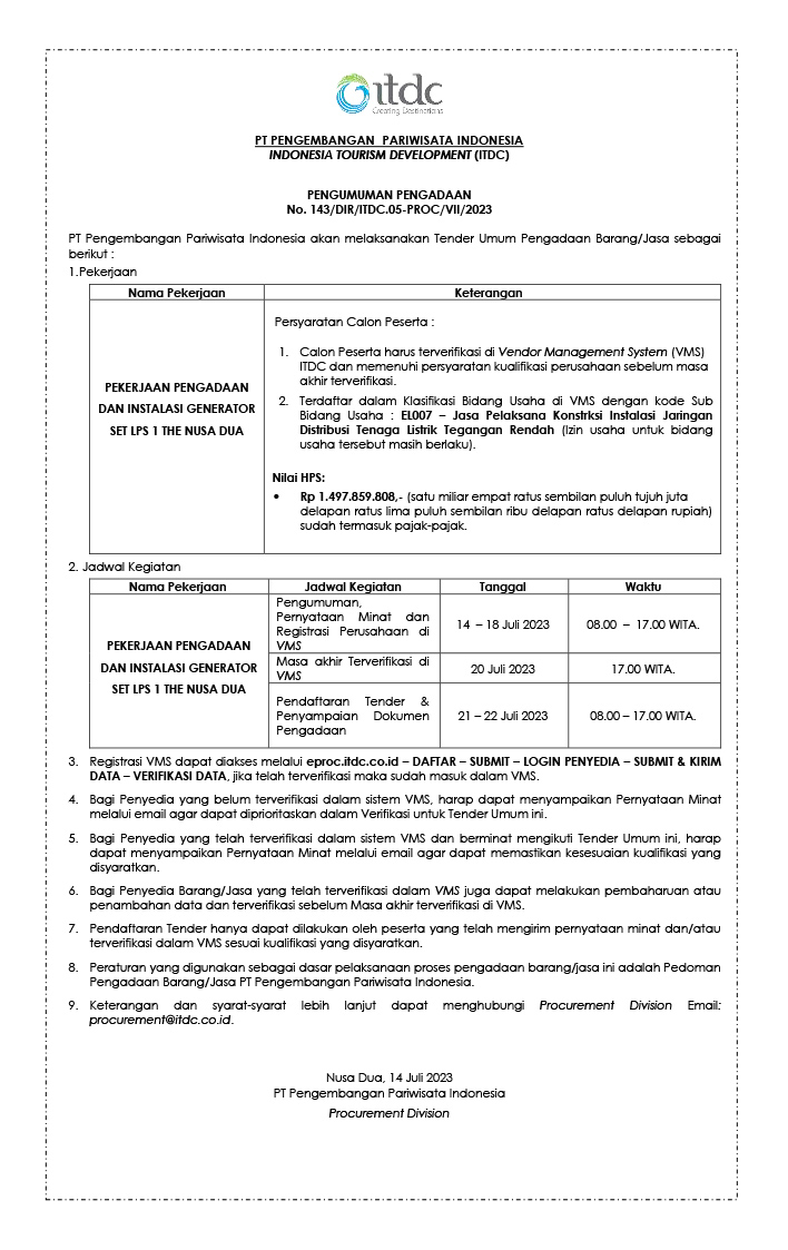 PENGUMUMAN PENGADAAN No. 143/DIR/ITDC.05-PROC/VII/2023