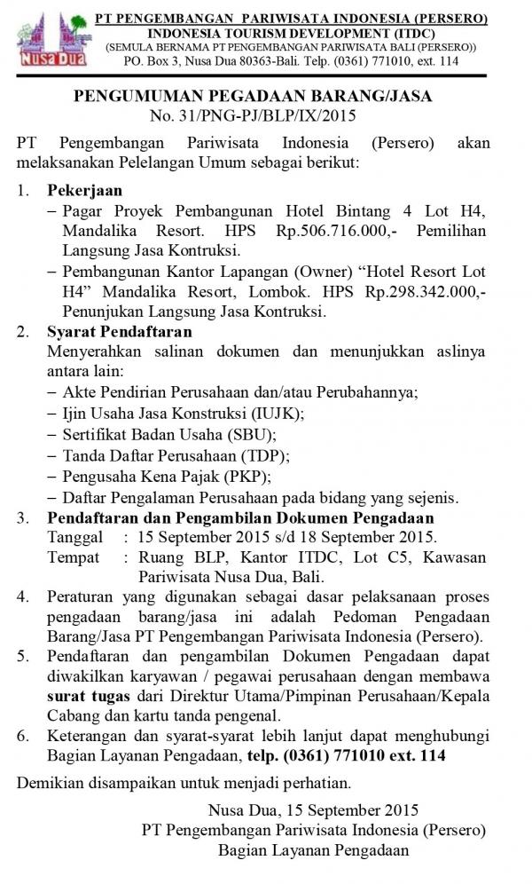 PEMBANGUNAN KANTOR LAPANGAN (OWNER) “HOTEL RESORT (LOT H-4)” MANDALIKA RESORT, LOMBOK