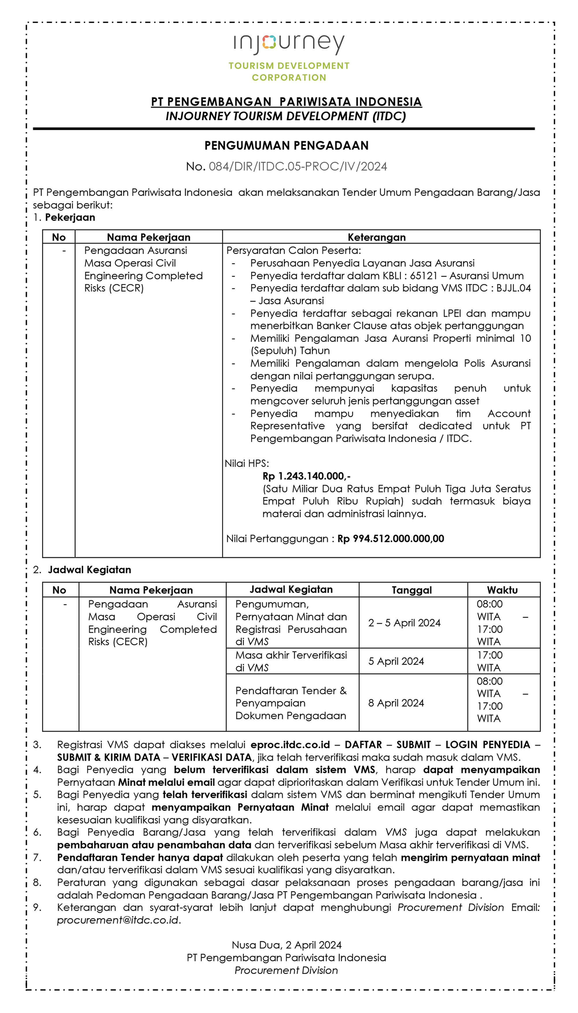 PENGUMUMAN PENGADAAN No. 084/DIR/ITDC.05-PROC/IV/2024