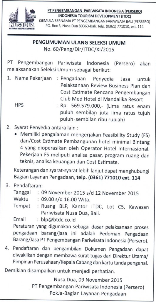 PENGADAAN PENYEDIA JASA UNTUK PELAKSANAAN REVIEW BUSINESS PLAN DAN COST ESTIMATE RENCANA PENGEMBANGAN CLUB MED HOTEL DI MANDALIKA RESORT