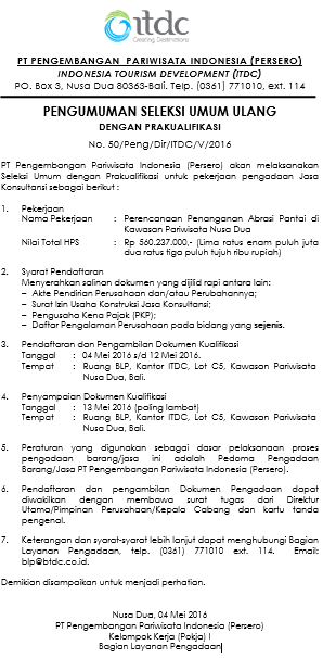 (PENGUMUMAN SELEKSI ULANG) PERENCANAAN PENANGANAN ABRASI PANTAI DI KAWASAN PARIWISATA NUSA DUA