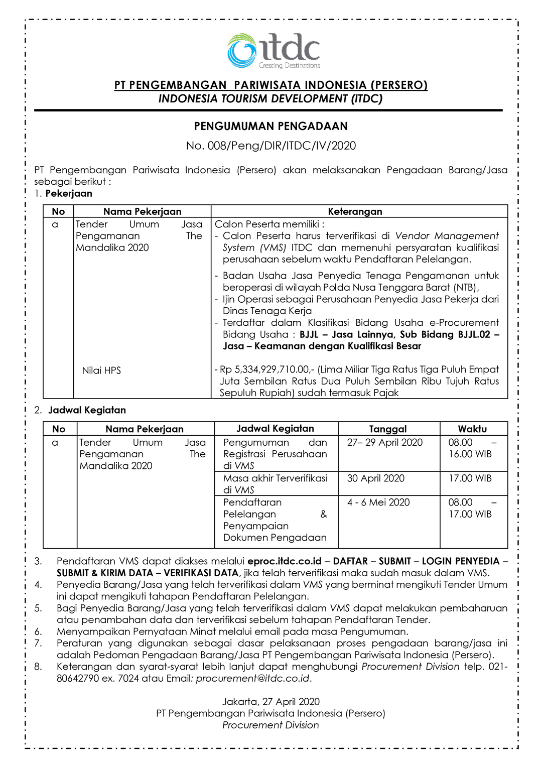 PENGUMUMAN PENGADAAN No. 008/Peng/DIR/ITDC/IV/2020