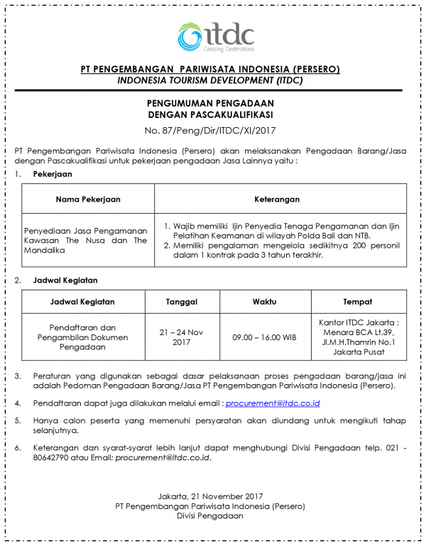 ANNOUNCEMENT OF PROCUREMENT WITH POST-QUALIFICATION No. 87 / Peng / Dir / ITDC / XI / 2017