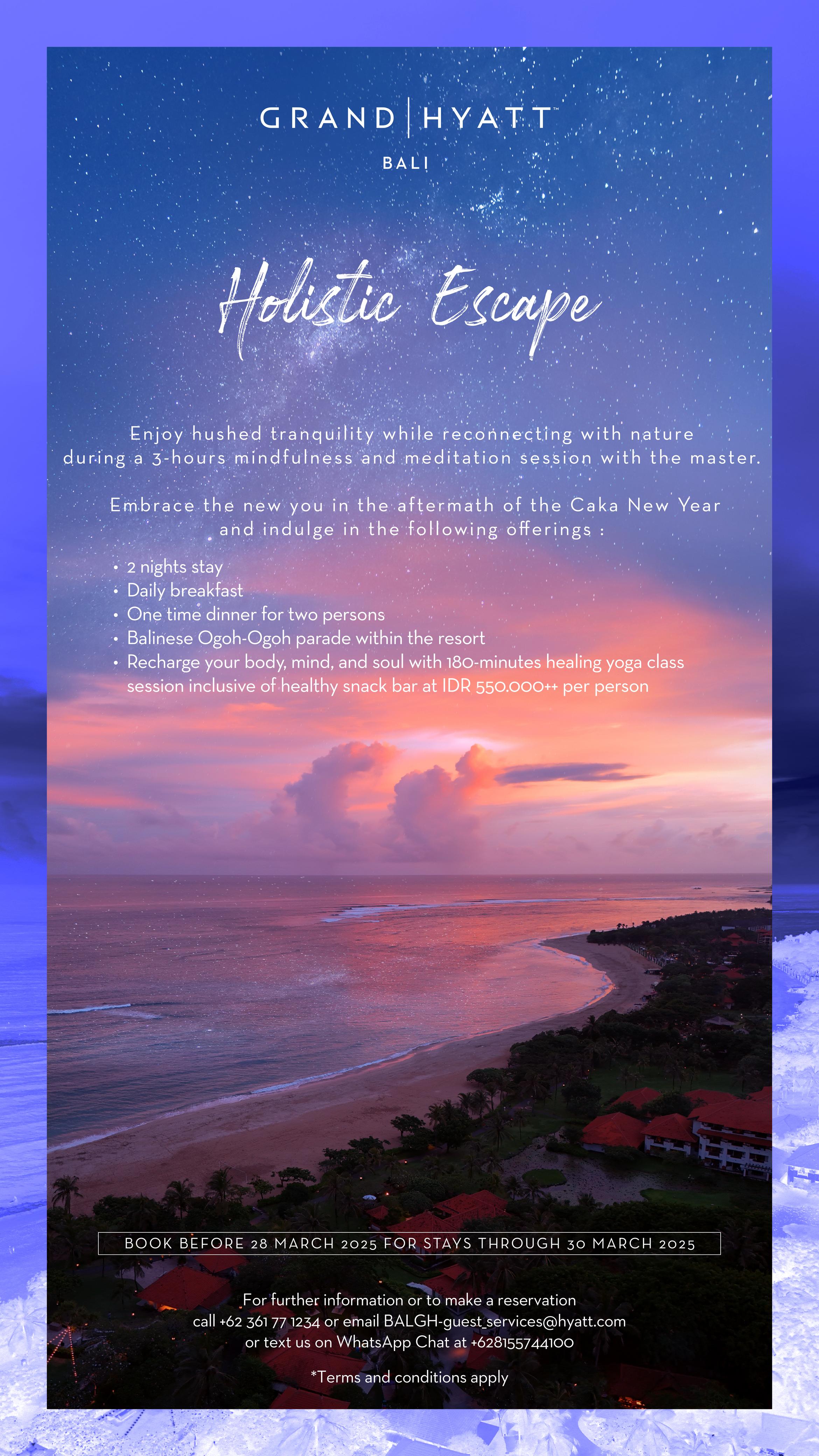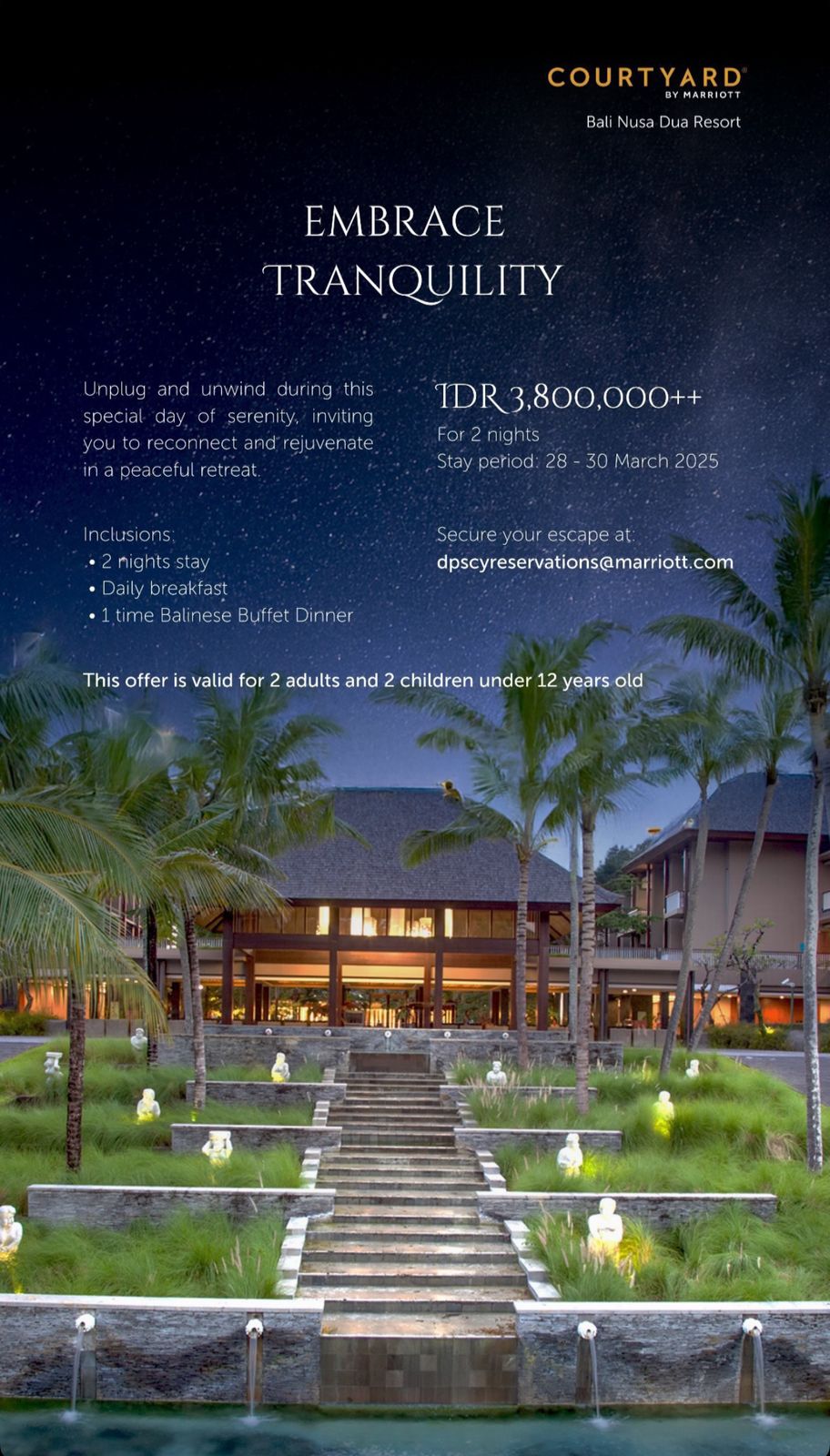 Unplug and unwind during this special day of serenity, inviting you to reconnect and rejuvenate in peaceful retreat at Courtyard by Marriot IDR 3.800.000++ for 2 nightsStay period 28-30 March 2025