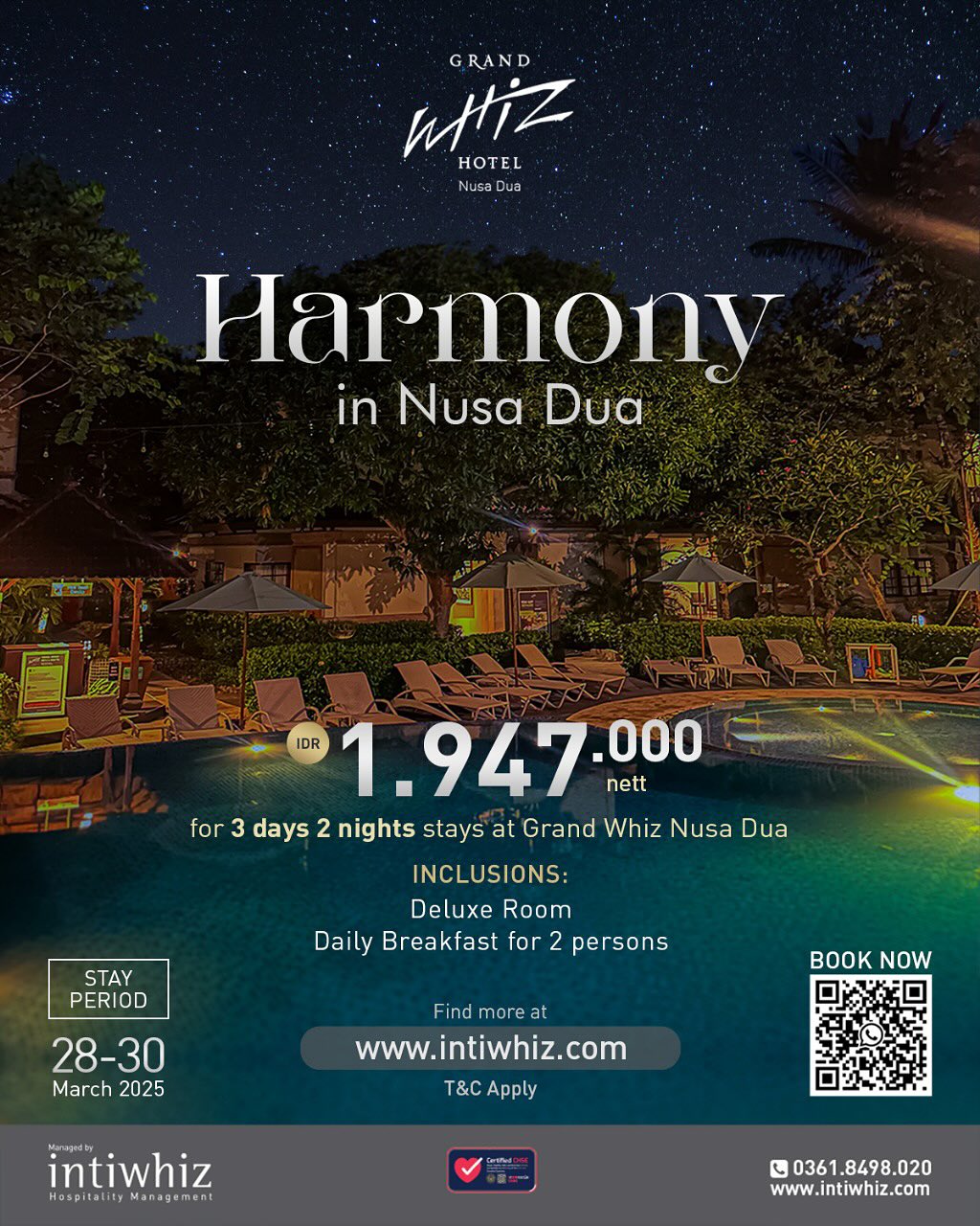 Harmony in Nusa Dua with Grand Whiz Nusa DuaIDR 2.900.000 nettfor 3 days 2 nights stays at Grand Whiz Nusa Dua at Deluxe Room include Daily breakfast for 2 persons one time lunch & Dinner on March 29, 2025