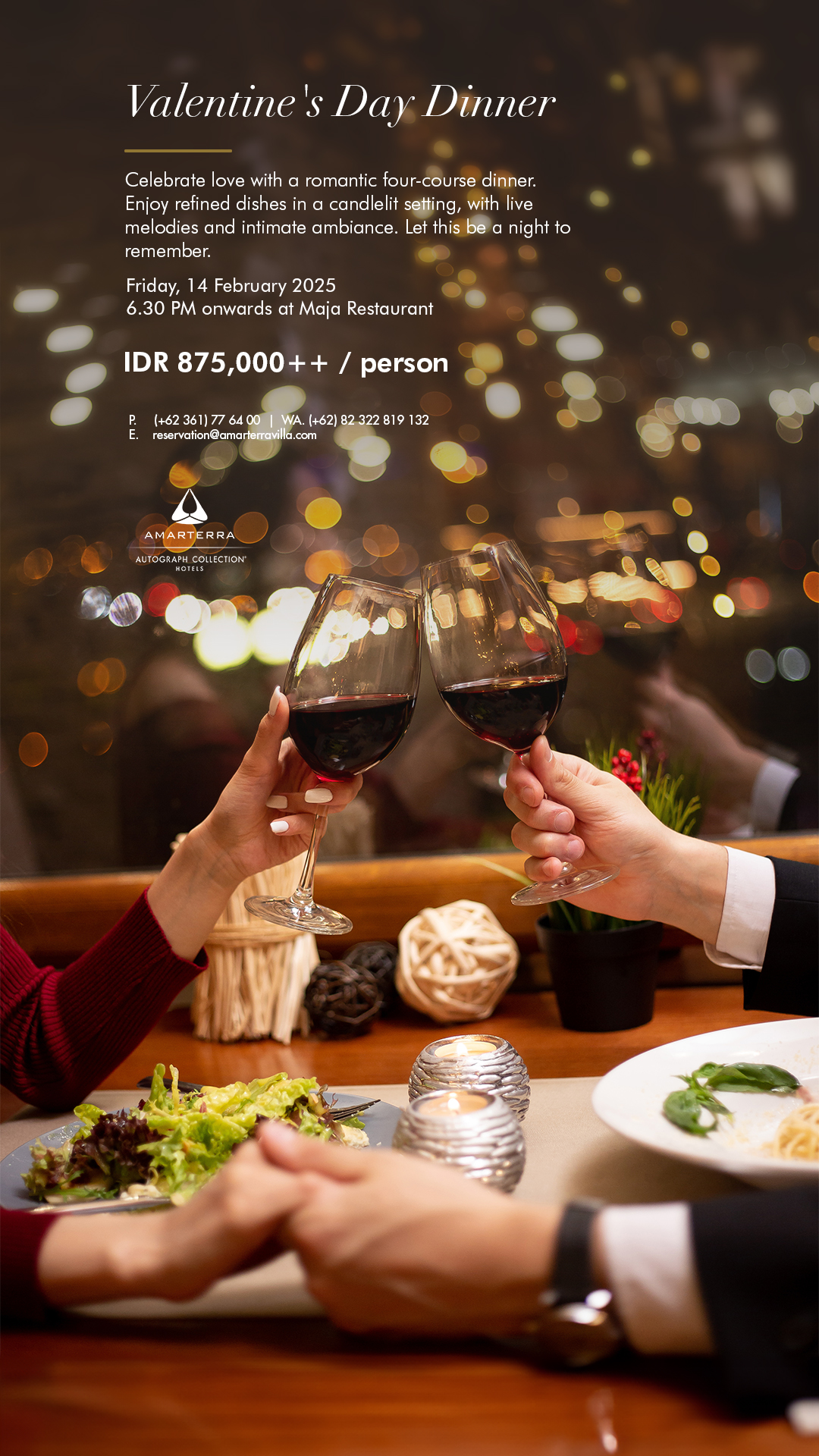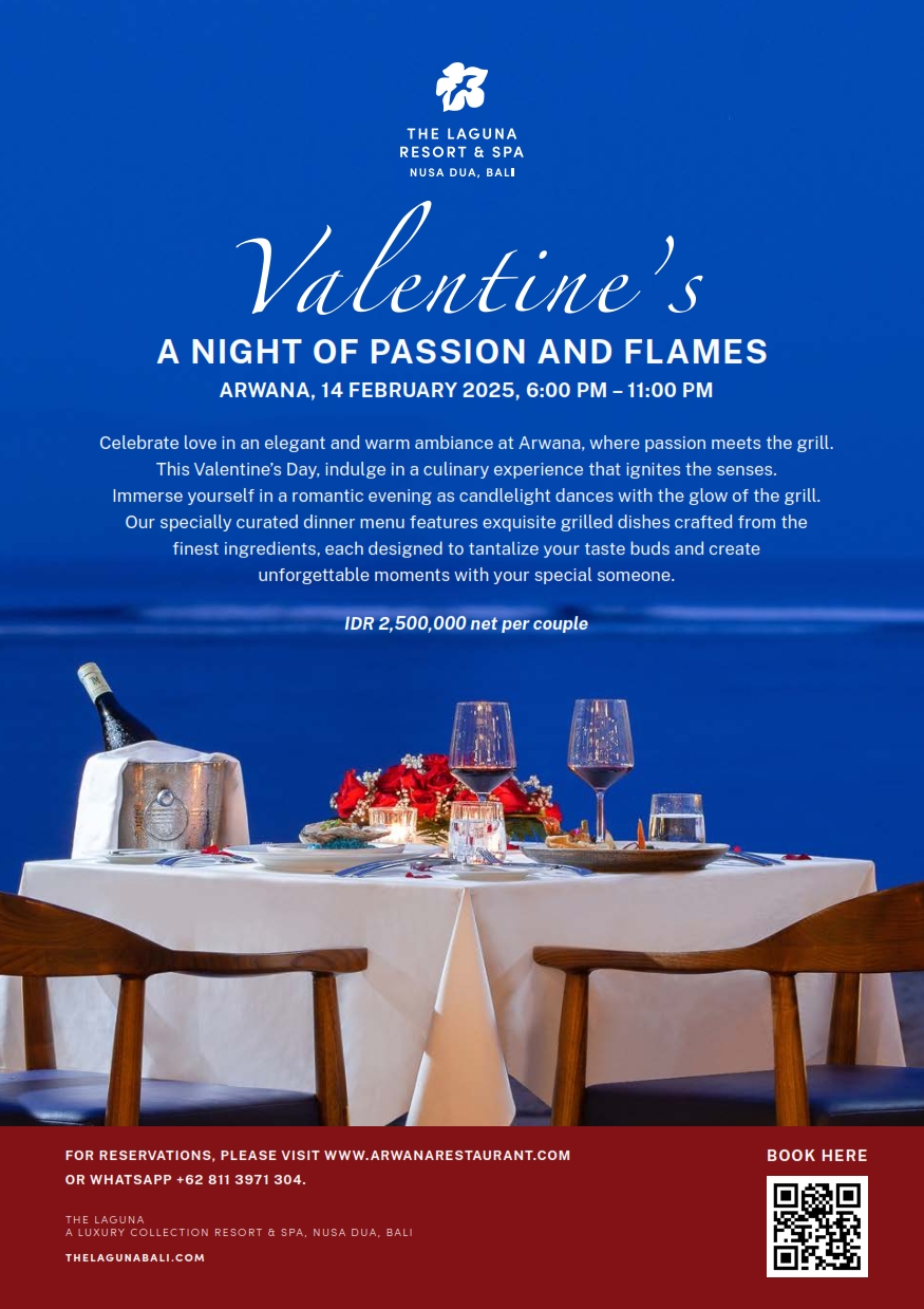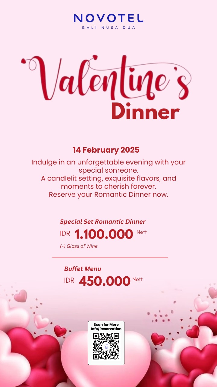 14 February 2025Indulge in an unforgettable evening with your someone special. A candlelit setting, exquisite flavors, and moments to cherish forever. Reserve your Romantic Dinner now!Special Set Romantic Dinner IDR 1.000.000 nett (+) Glass of WineBuffet Menu IDR 450.000 nett