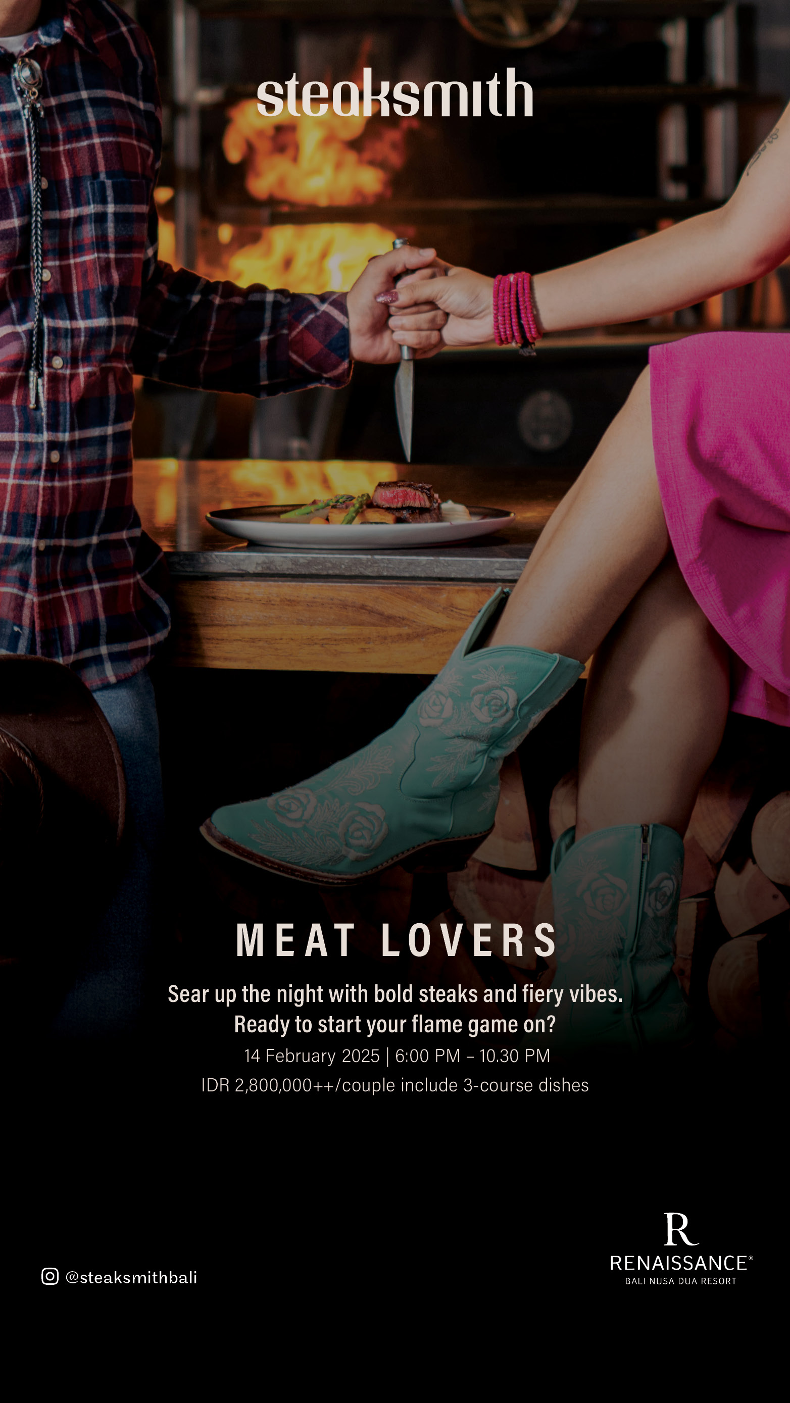 Meat LoversSear Up the night with bold steaks and fiery vibes.Ready to start your flame game on?14 February 2025 | 6:00 PM - 10.30 PM IDR 2.800.000++/couple include 3-course dishes