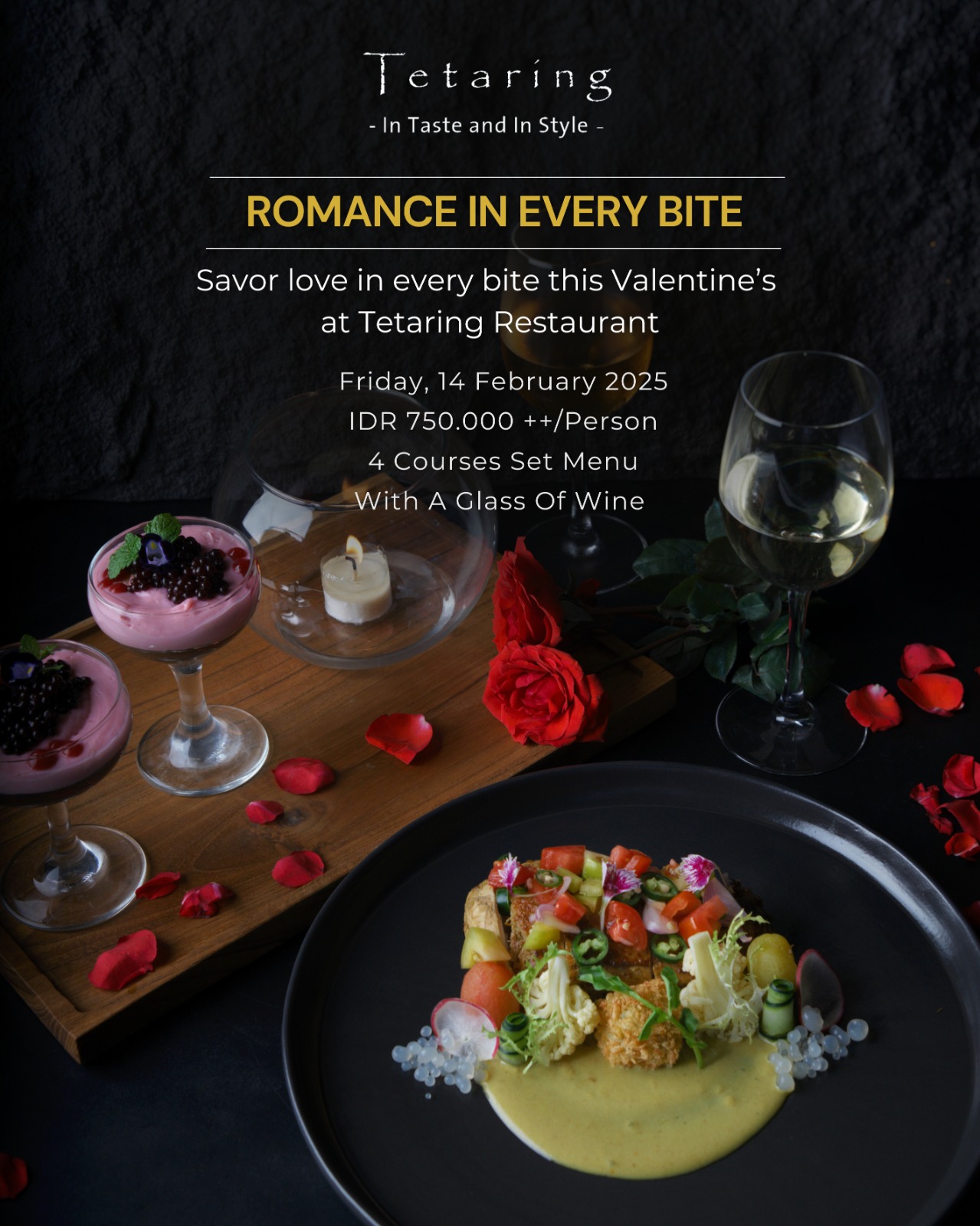Savor love in every bite this Valentine's at Tetaring Restaurant Friday, 14 Feb 2025 IDR 750.000 ++/person 4 course Set MenuWith a glass of Winereservationnusadua@kayumanis.com