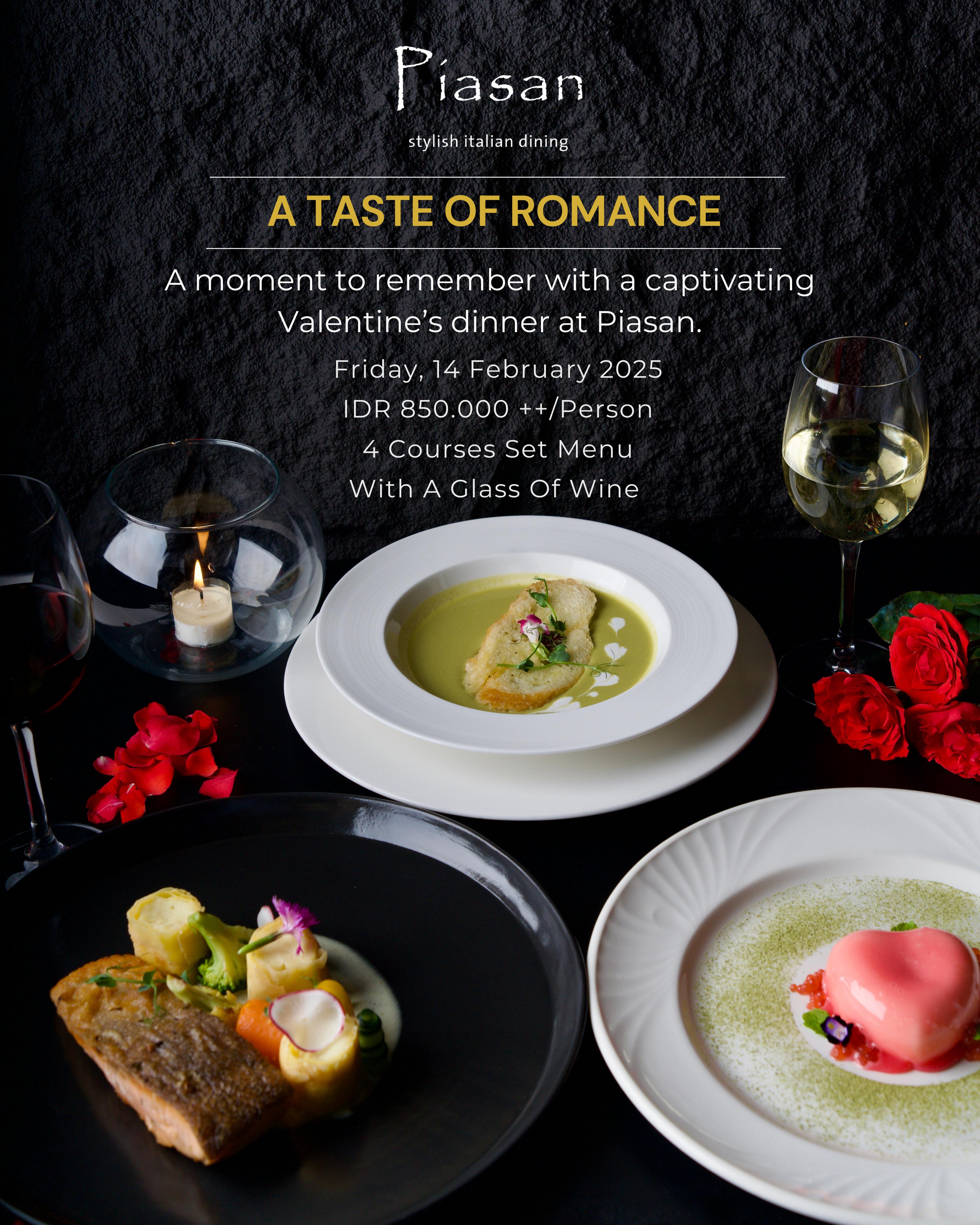 A moment to remember with a captivating Valentine's Dinner at Piasan. Friday, 14 Feb 2025 IDR 850.000 ++/person 4 course Set MenuWith a glass of Wine