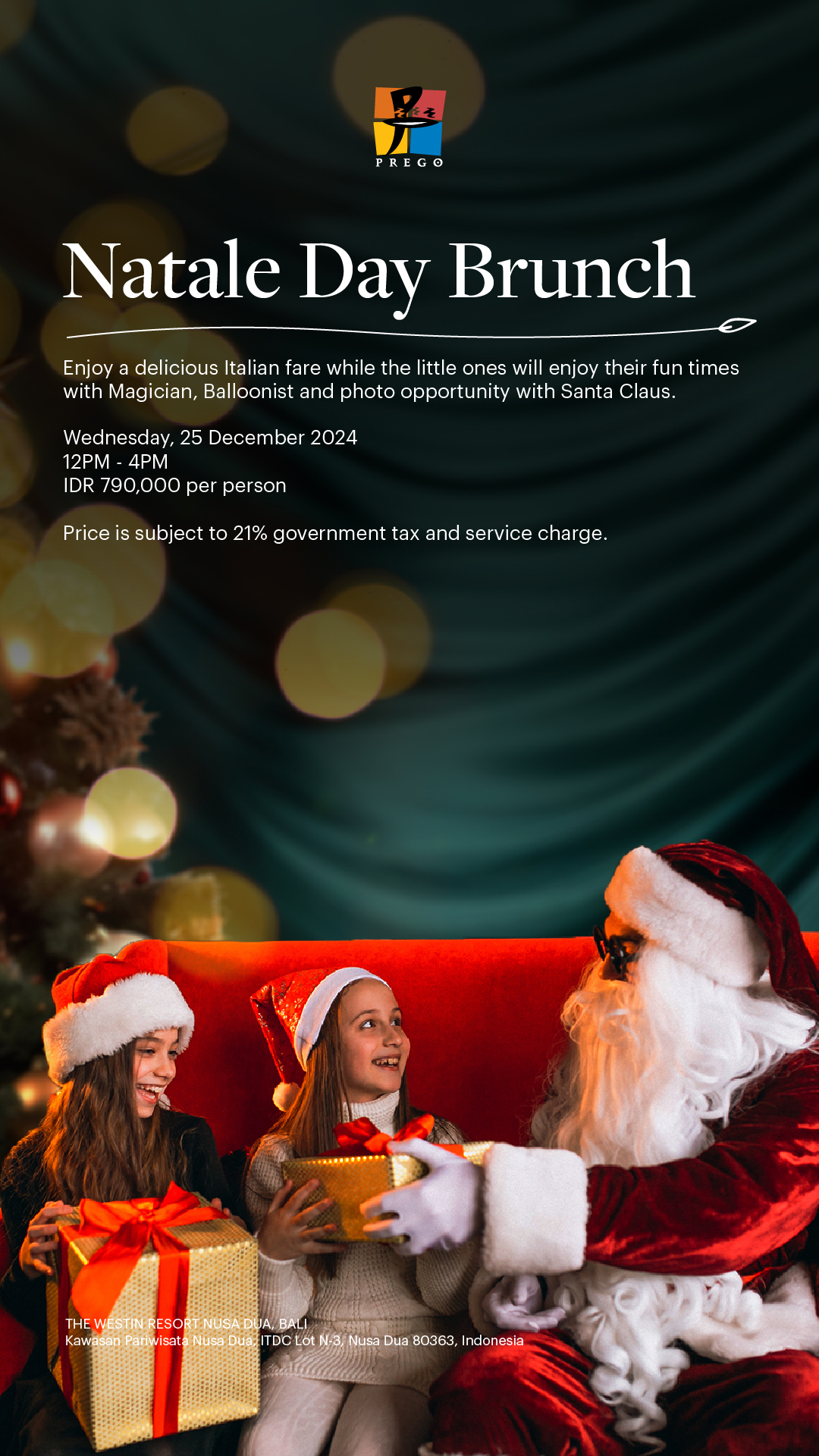 Enjoy a delicious Italian fare while the little ones will enjoy their fun times with Magician, Balloonist and photo opportunity with Santa Claus.Wednesday, 25 December 202412PM - 4PMIDR 790,000 per personPrice is subject to 21% government tax and service charge.THE WESTIN RESORT NUSA DUA, BALIKawasan Pariwisata Nusa Dua, ITDC Lot N-3, Nusa Dua 80363, Indonesia