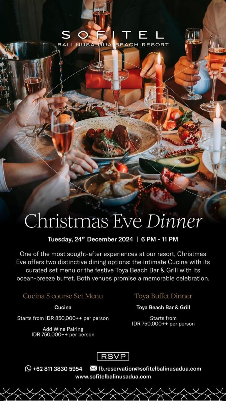 Christmas Eve DinnerTuesday, 24th December 2024 | 6 PM - 11 PMOne of the most sought-after experiences at our resort, Christmas Eve offers two distinctive dining options: the intimate Cucina with its curated set menu or the festive Toya Beach Bar & Grill with its ocean-breeze buffet. Both venues promise a memorable celebration.Cucina 5 course Set Menu | CucinaStarts from IDR 850,000++ per personAdd Wine Pairing IDR 750,000++ per person Toya Buffet Dinner | Toya Beach Bar & GrillStarts from IDR 750,000++ per person RSVP: +62 811 3830 5954fb.reservation@sofitelbalinusadua.comwww.sofitelbalinusadua.com
