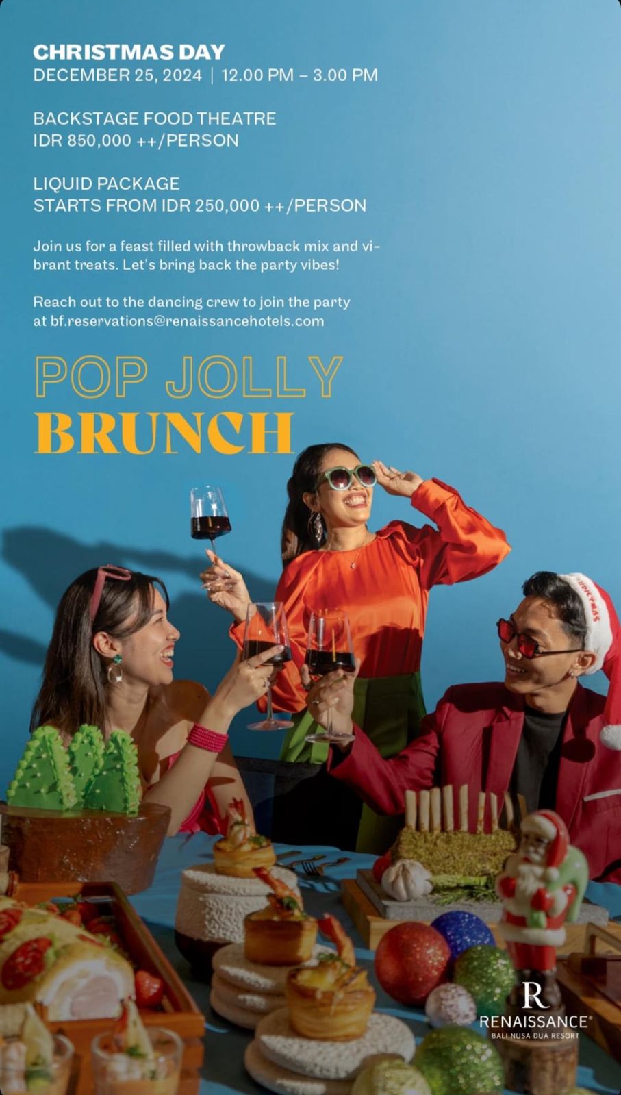 CHRISTMAS DAYDECEMBER 25, 2024 | 12.00 PM - 3.00 PMBACKSTAGE FOOD THEATRE IDR 850,000++/PERSONLIQUID PACKAGE STARTS FROM IDR 250,000 ++/PERSONJoin us for a feast filled with throwback mix and vi- brant treats. Let's bring back the party vibes!Reach out to the dancing crew to join the party at bf.reservations@renaissancehotels.com