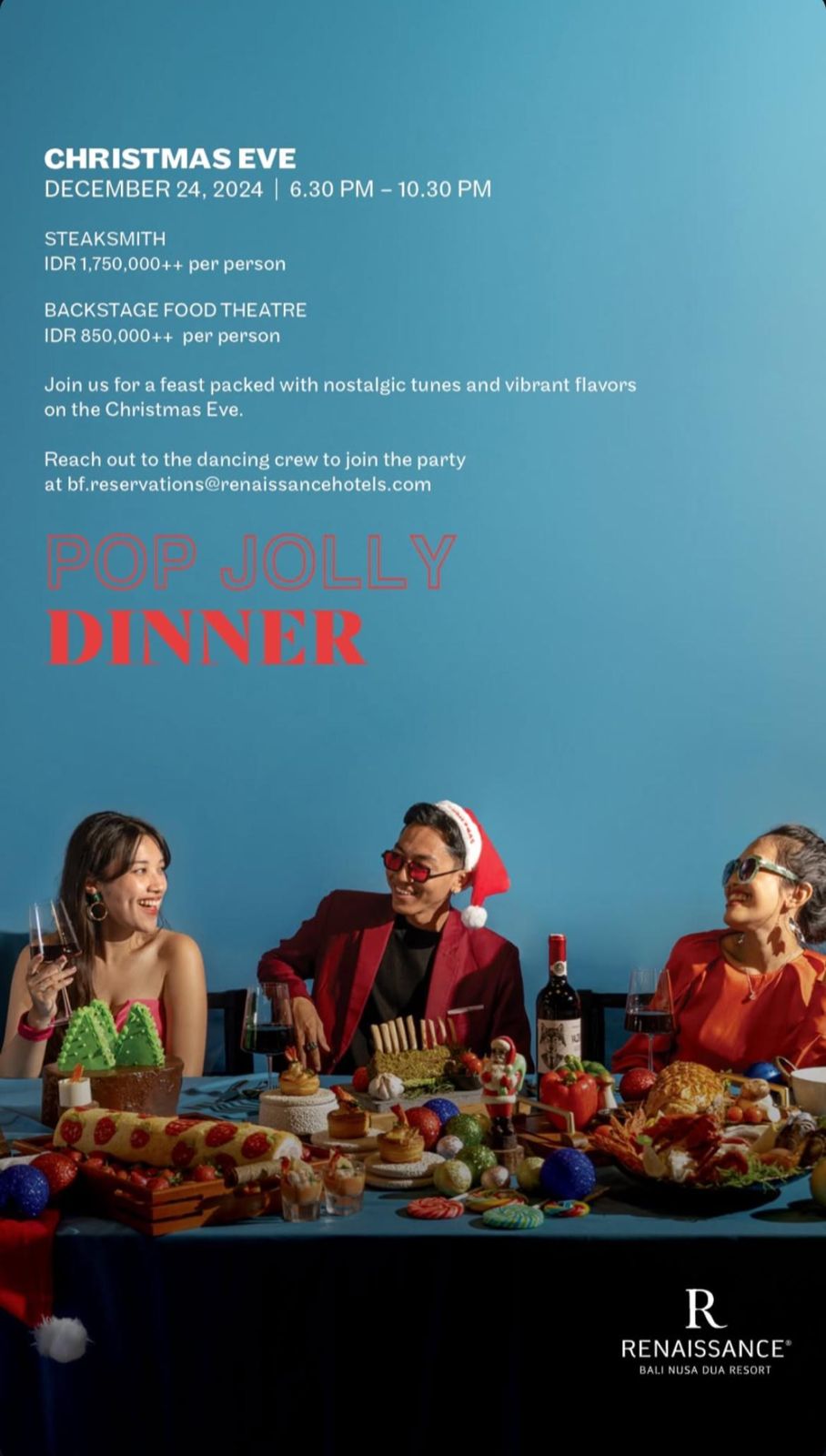 CHRISTMAS EVEDECEMBER 24, 2024 | 6.30 PM - 10.30 PMSTEAKSMITH IDR 1,750,000++ per personBACKSTAGE FOOD THEATRE IDR 850,000++ per personJoin us for a feast packed with nostalgic tunes and vibrant flavors on the Christmas Eve.Reach out to the dancing crew to join the party at bf.reservations@renaissancehotels.com