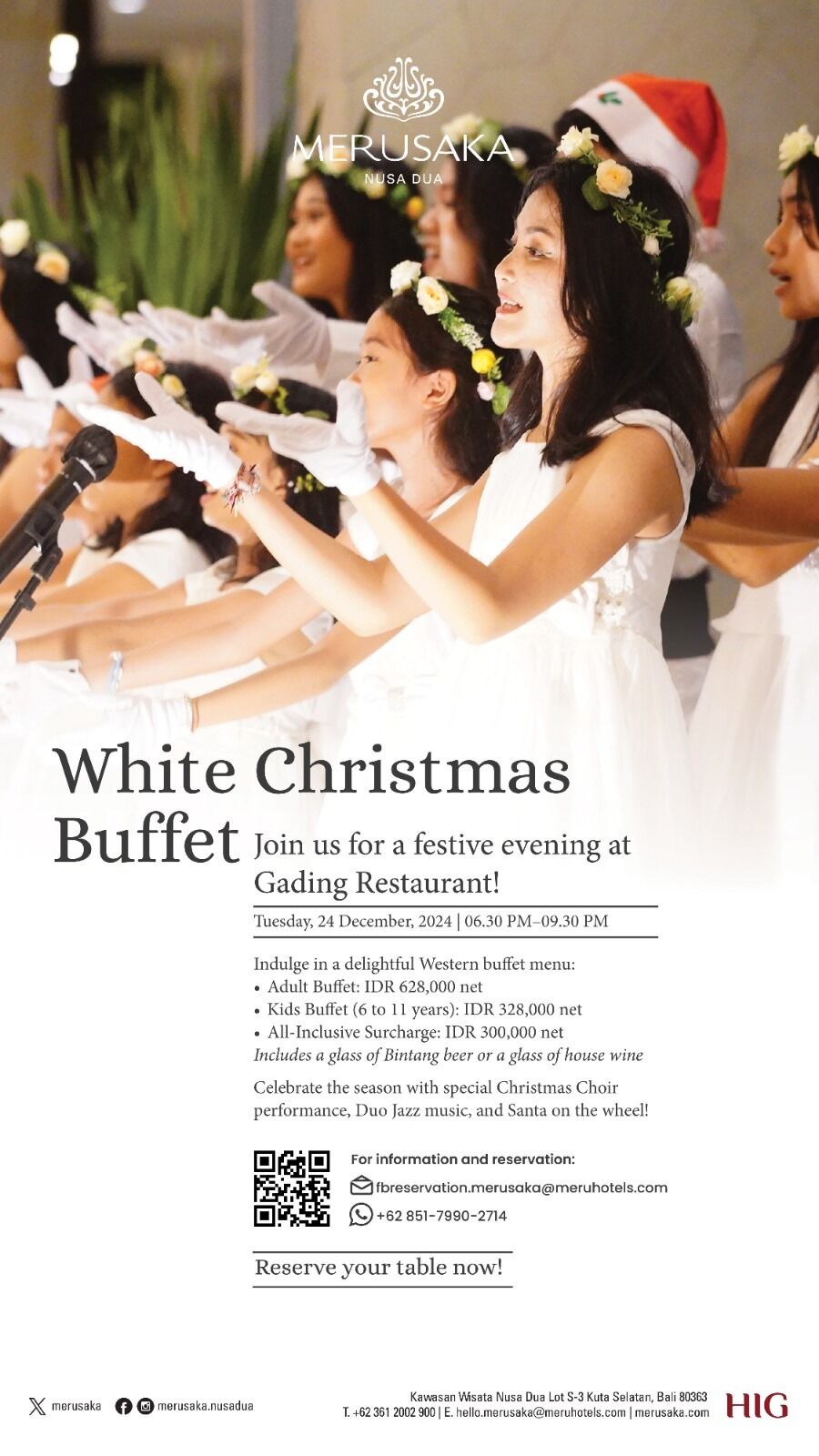 White Christmas Buffet Join us for a festive evening at Gading Restaurant!Tuesday, 24 December, 2024 | 06.30 PM-09.30 PMIndulge in a delightful Western buffet menu:.Adult Buffet: IDR 628,000 netKids Buffet (6 to 11 years): IDR 328,000 netAll-Inclusive Surcharge: IDR 300,000 net Includes a glass of Bintang beer or a glass of house wineCelebrate the season with special Christmas Choir performance, Duo Jazz music, and Santa on the wheel!For information and reservation:fbreservation.merusaka@meruhotels.com+62 851-7990-2714Reserve your table now!Kawasan Wisata Nusa Dua Lot S-3 Kuta Selatan, Bali 80363T. +62 361 2002 900 | E. hello.merusaka@meruhotels.com merusaka.com