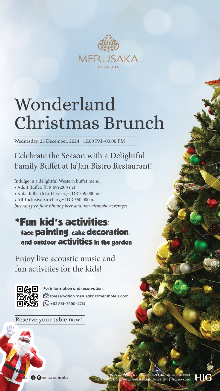 Wednesday, 25 December, 2024 | 12.00 PM-03.00 PMCelebrate the Season with a Delightful Family Buffet at Ja'Jan Bistro Restaurant!Indulge in a delightful Western buffet menu:• Adult Buffet: IDR 699,000 net• Kids Buffet (6 to 11 years): IDR 359,000 net• All-Inclusive Surcharge: IDR 350,000 netIncludes free-flow Bintang beer and non-alcoholic beverages*Fun kid's activities:face painting, cake decoration, and outdoor activities in the gardenEnjoy live acoustic music and fun activities for the kids! For information and reservation:fbreservation.merusaka@meruhotels.com+62 851-7990-2714Reserve your table now!Kawasan Wisata Nusa Dua Lot S-3 Kuta Selatan, Bali 80363T. +62 361 2002 900 | EAiello.merusaka@meruhotels.com | merusaka.com