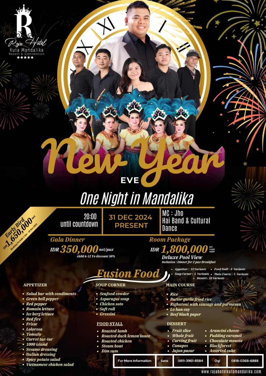 One Night in Mandalika20:00 until countdown | 31 DEC 2024 | MC: Jho, Hai Band & Cultural Dance Early Bird IDR1,650,000 netBooking Periode 1 Dec-20 Dec 2024 Gala Dinner IDR 350,000 net/paxRoom Package IDR 1,800,000 net room nightDeluxe Pool View, Inclusion: Dinner for 2 pax Breakfast For More InformationSans 0811-3961-8584Ogi 0818-0368-6888www.rajahotelkutamandalika.com