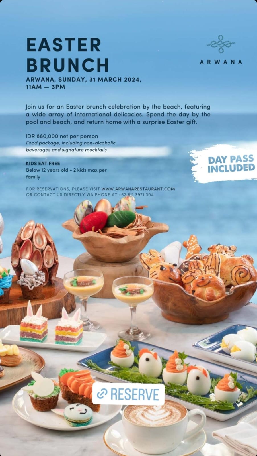 ARWANA, SUNDAY, 31 MARCH 2024, 11AM-3PMJoin us for an Easter brunch celebration by the beach, featuring a wide array of international delicacies. Spend the day by the pool and beach, and return home with a surprise Easter gift.IDR 880,000 net per personFood package, including non-alcoholic beverages and signature mocktailsKIDS EAT FREEBelow 12 years old - 2 kids max per familyDAY PASS INCLUDED