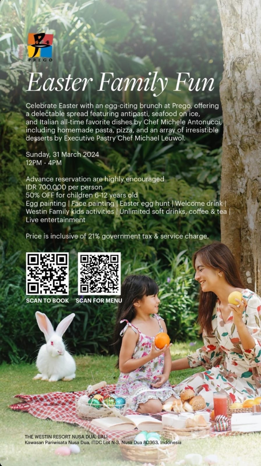 Celebrate Easter with an egg-citing brunch at Prego, offering a delectable spread featuring antipasti, seafood on ice, and Italian all-time favorite dishes by Chef Michele Antonucci, including homemade pasta, pizza, and an array of irresistible desserts by Executive Pastry Chef Michael Leuwol.Sunday, 31 March 202412PM - 4PMAdvance reservation are highly encouragedIDR 700,000 per person50% OFF for children 6-12 years oldEgg painting | Face painting | Easter egg hunt | Welcome drink | Westin Family kids activities | Unlimited soft drinks, coffee & tea Live entertainmentPrice is inclusive of 21% government tax & service charge.