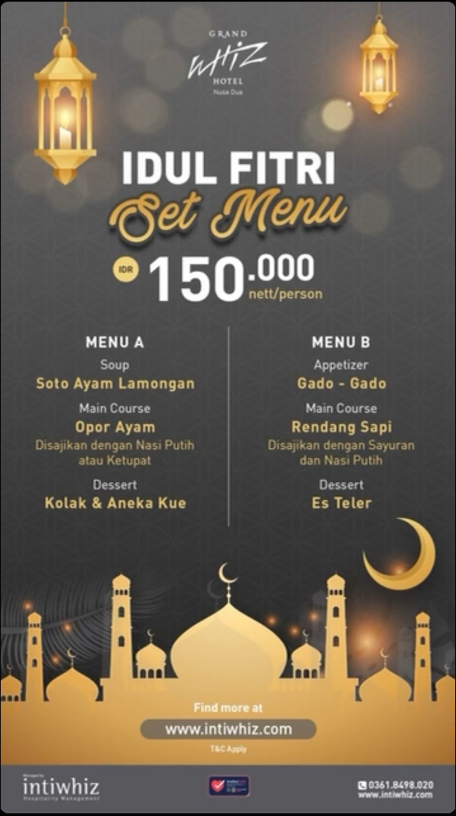 IDR 150.000 nett/personMENU ASoupSoto Ayam LamonganMain CourseOpor AyamDisajikan dengan Nasi Putih atau KetupatDessertKolak & Aneka KueMENU BAppetizerGado GadoMain Course Rendang SapiDisajikan dengan Sayuran dan Nasi PutihDessert Es Teler