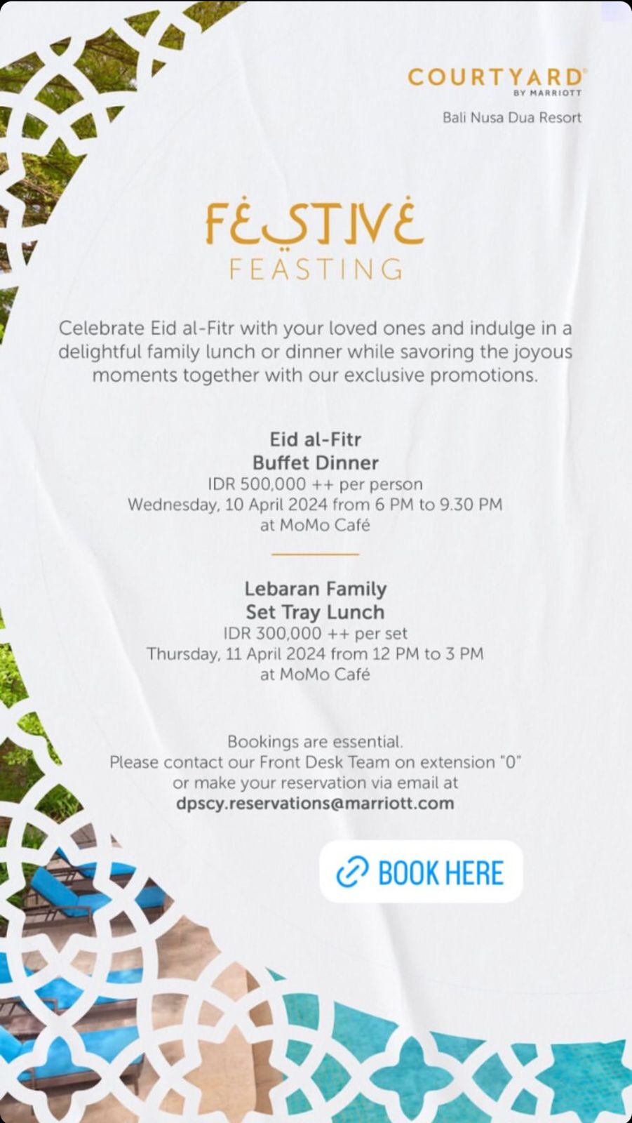 Celebrate Eid al-Fitr with your loved ones and indulge in a delightful family lunch or dinner while savoring the joyous moments together with our exclusive promotions.Eid al-Fitr Buffet DinnerIDR 500,000 ++ per person Wednesday, 10 April 2024 from 6 PM to 9.30 PM at MoMo CaféLebaran Family Set Tray LunchIDR 300,000 ++ per setThursday, 11 April 2024 from 12 PM to 3 PM at MoMo CaféBookings are essential.Please contact our Front Desk Team on extension "0" or make your reservation via email at dpscy.reservations@marriott.com