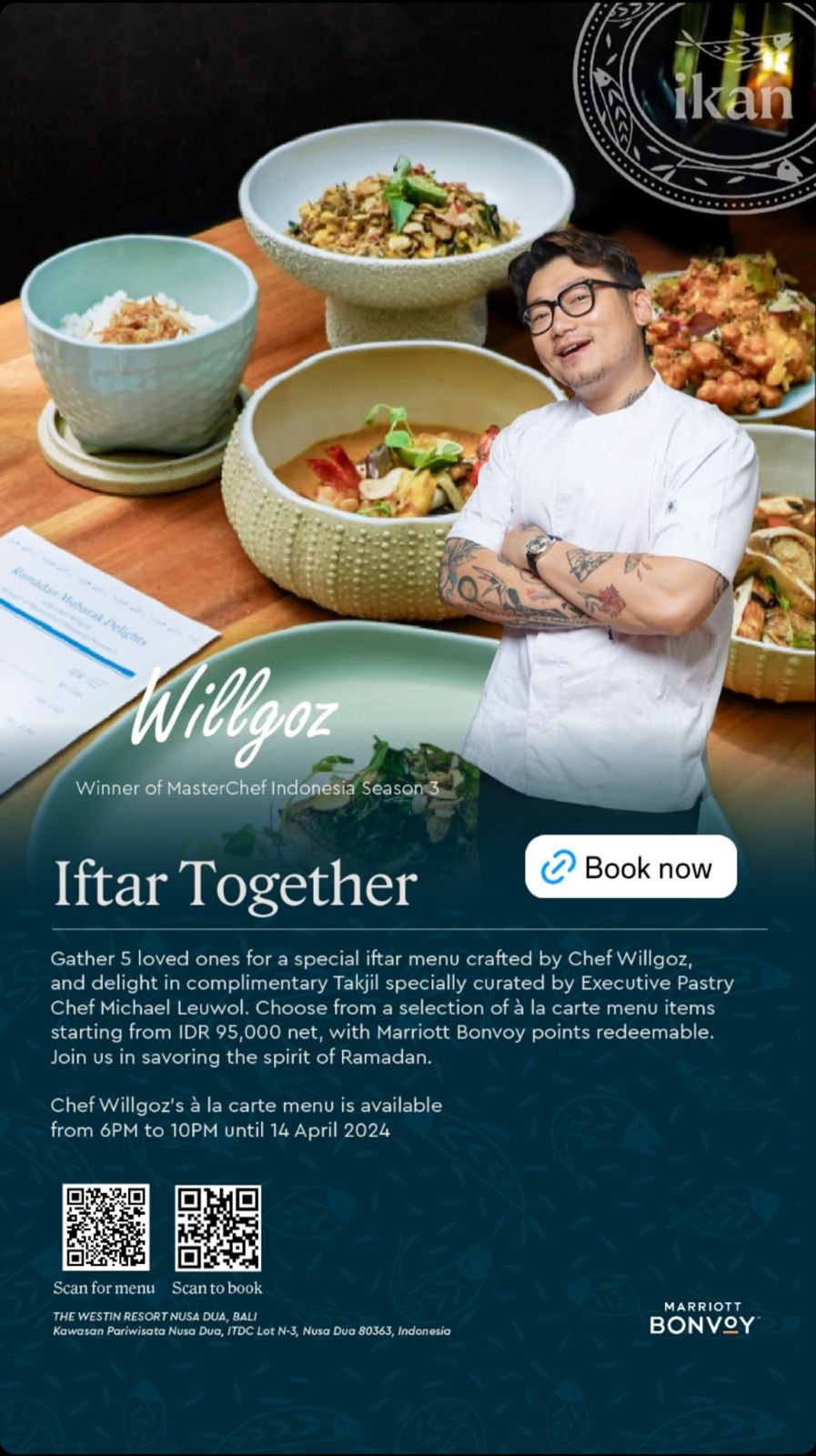 WillgozWinner of MasterChef Indonesia Season 3Iftar TogetherGather 5 loved ones for a special iftar menu crafted by Chef Willgoz, and delight in complimentary Takjil specially curated by Executive Pastry Chef Michael Leuwol. Choose from a selection of à la carte menu items starting from IDR 95,000 net, with Marriott Bonvoy points redeemable. Join us in savoring the spirit of Ramadan.Chef Willgoz's à la carte menu is available from 6PM to 10PM until 14 April 2024