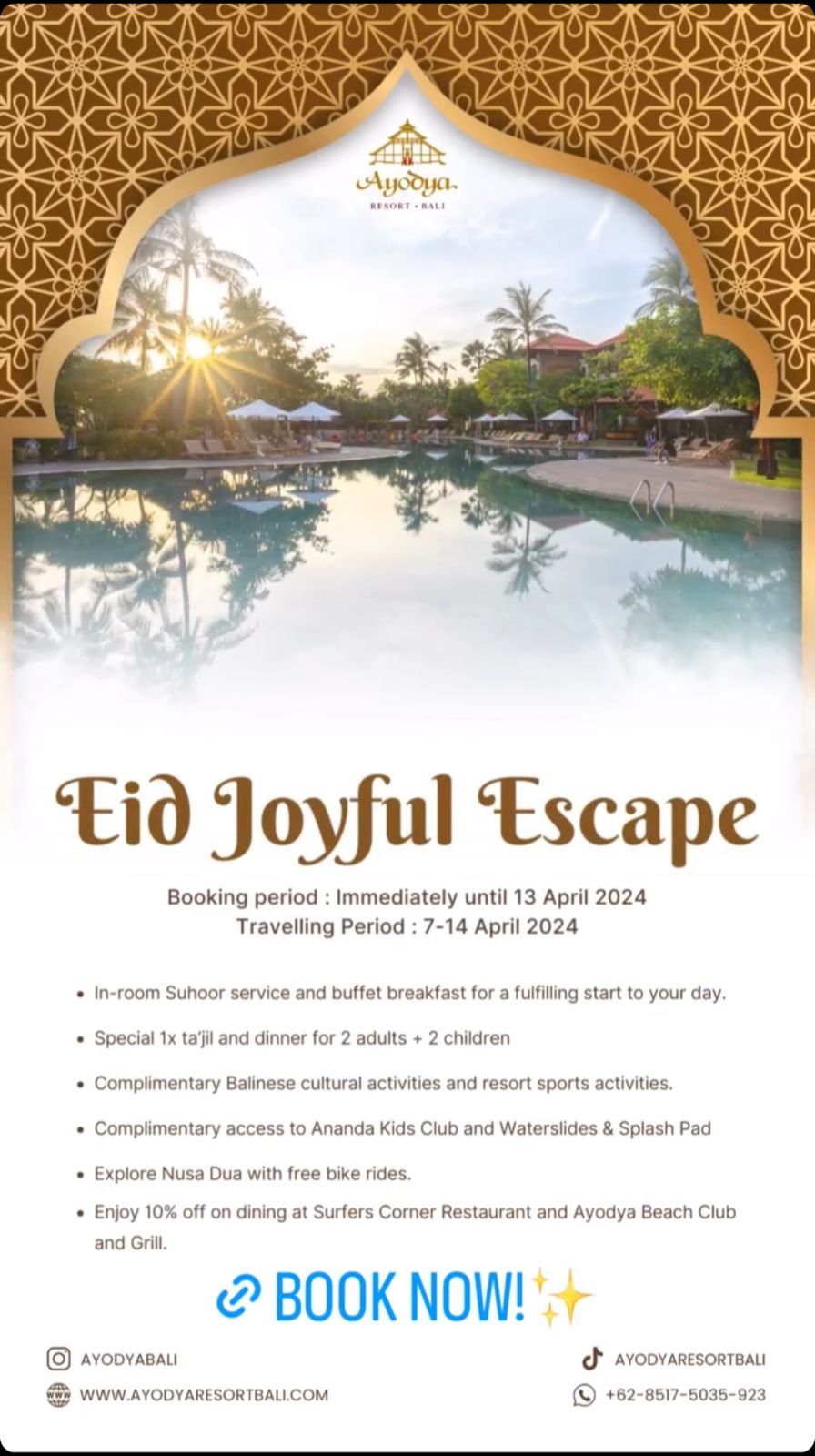 Booking period : Immediately until 13 April 2024 Travelling Period: 7-14 April 2024• In-room Suhoor service and buffet breakfast for a fulfilling start to your day.• Special 1x ta'jil and dinner for 2 adults + 2 children• Complimentary Balinese cultural activities and resort sports activities.• Complimentary access to Ananda Kids Club and Waterslides & Splash Pad• Explore Nusa Dua with free bike rides.Enjoy 10% off on dining at Surfers Corner Restaurant and Ayodya Beach Club and Grill.