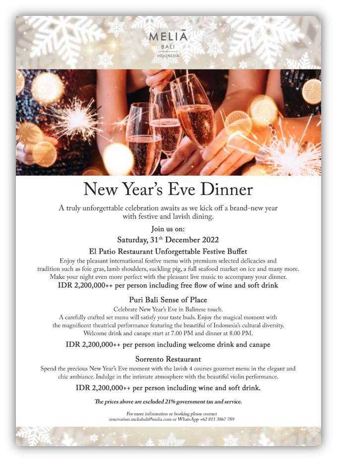 A truly unforgettable celebration awaits as we kick off a brand-new year with festive and lavish dining.Join us on: Saturday, 31th December 2022El Patio Restaurant Unforgettable Festive BuffetEnjoy the pleasant international festive menu with premium selected delicacies and tradition such as foie gras, lamb shoulders, suckling pig, a full seafood market on ice and many more. Make your night even more perfect with the pleasant live music to accompany your dinner.IDR 2,200,000++ per person including free flow of wine and soft drink. Puri Bali Sense of PlaceCelebrate New Year's Eve in Balinese touch.A carefully crafted set menu will satisfy your taste buds. Enjoy the magical moment with the magnificent theatrical performance featuring the beautiful of Indonesia's cultural diversity. Welcome drink and canape start at 7.00 PM and dinner at 8.00 PM.IDR 2,200,000++ per person including welcome drink and canape. Sorrento RestaurantSpend the precious New Year's Eve moment with the lavish 4 courses gourmet menu in the elegant and chic ambiance. Indulge in the intimate atmosphere with the beautiful violin performance.IDR 2,200,000++ per person including wine and soft drink.The prices above are excluded 21% government tax and service.For more information or booking please contact reservation.meliabali@melia.com or WhatsApp +62 811 3867 789
