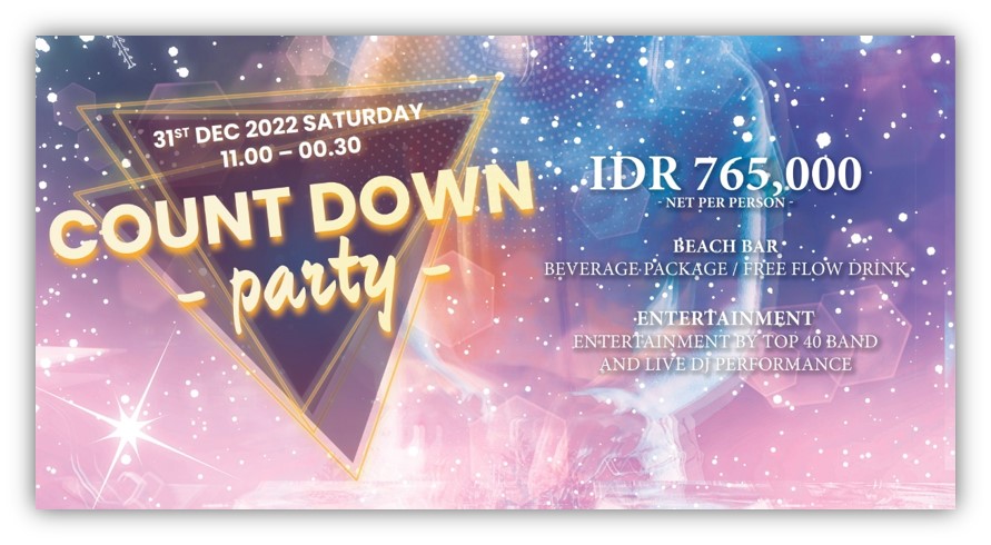 31st Dec 2022 Saturday, 11.00 - 00.30IDR 756.000 Net/personBeach Bar (Beverage Package/Free Flow Drink)Entertainment by Top 40 Band and Live DJ Performance