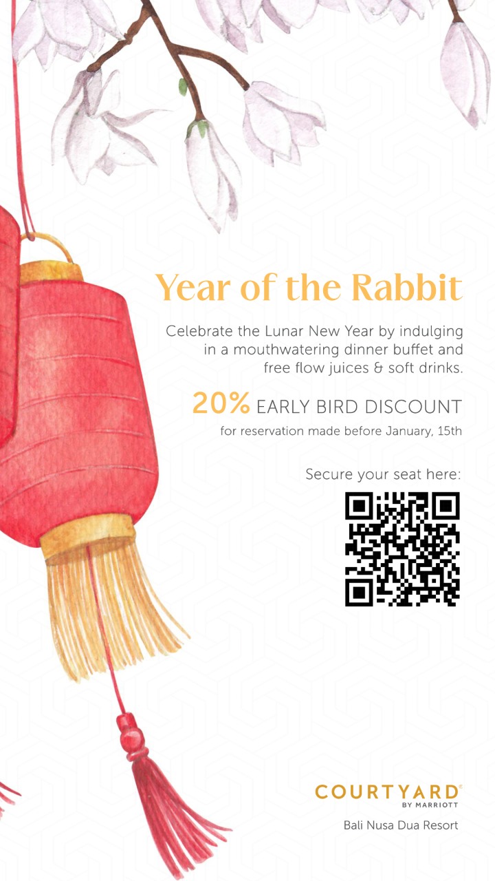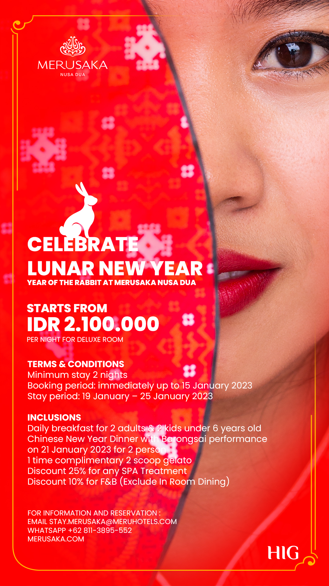 CELEBRATE LUNAR NEW YEARYEAR OF THE RABBIT AT MERUSAKA NUSA DUASTARTS FROM IDR 2.100.000 PER NIGHT FOR DELUXE ROOMTERMS & CONDITIONS- Minimum stay 2 nights- Booking period: immediately up to 15 January 2023 - Stay period: 19 January - 25 January 2023 INCLUSIONS- Daily breakfast for 2 adults & 2 kids under 6 years old - Chinese New Year Dinner with Barongsai performance on 21 January 2023 for 2 person- 1 time complimentary 2 scoop gelato- Discount 25% for any SPA Treatment- Discount 10% for F&B (Exclude In Room Dining) FOR INFORMATION AND RESERVATION:EMAIL STAY.MERUSAKA@MERUHOTELS.COM WHATSAPP +62 811-3895-552MERUSAKA.COM