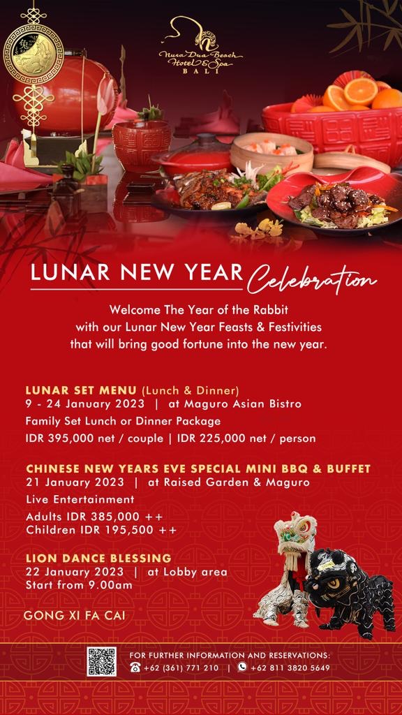 Welcome The Year of the Rabbit with our Lunar New Year Feasts & Festivities that will bring good fortune into the new year.LUNAR SET MENU (Lunch & Dinner)9 - 24 January 2023 at Maguro Asian BistroFamily Set Lunch or Dinner PackageIDR 395,000 net/ couple | IDR 225,000 net / personCHINESE NEW YEARS EVE SPECIAL MINI BBQ & BUFFET21 January 2023 | at Raised Garden & MaguroLive EntertainmentAdults IDR 385,000 ++Children IDR 195,500 ++LION DANCE BLESSING22 January 2023 at Lobby area Start from 9.00amGONG XI FA CAIFOR FURTHER INFORMATION AND RESERVATIONS: +62 (361) 771 210 | +62 811 3820 5649