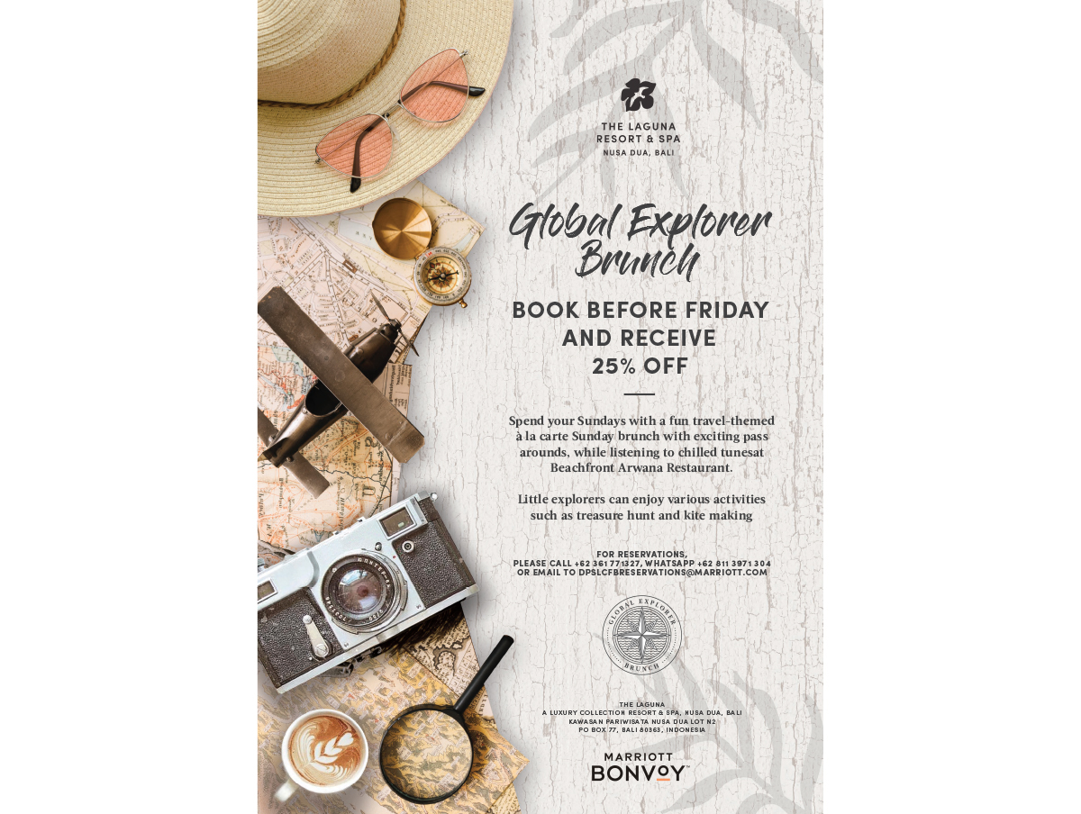 BOOK BEFORE FRIDAY AND RECEIVE 25% OFFARWANA RESTAURANT, FROM 12:00 PM TO 3:00 PM Spend your Sundays with a fun travel-themed à la carte Sunday brunch with exciting pass arounds, while listening to chilled tunesat Beachfront Arwana Restaurant.Little explorers can enjoy various activities such as treasure hunt and kite making.Little explorers aged 12 and below, dine for free.Limited seatings, advance booking is required.FOR RESERVATIONS, PLEASE CALL +62 361 771327, WHATSAPP +62 811 3971 304 OR EMAIL TO DPSLCFBRESERVATIONS@MARRIOTT.COM