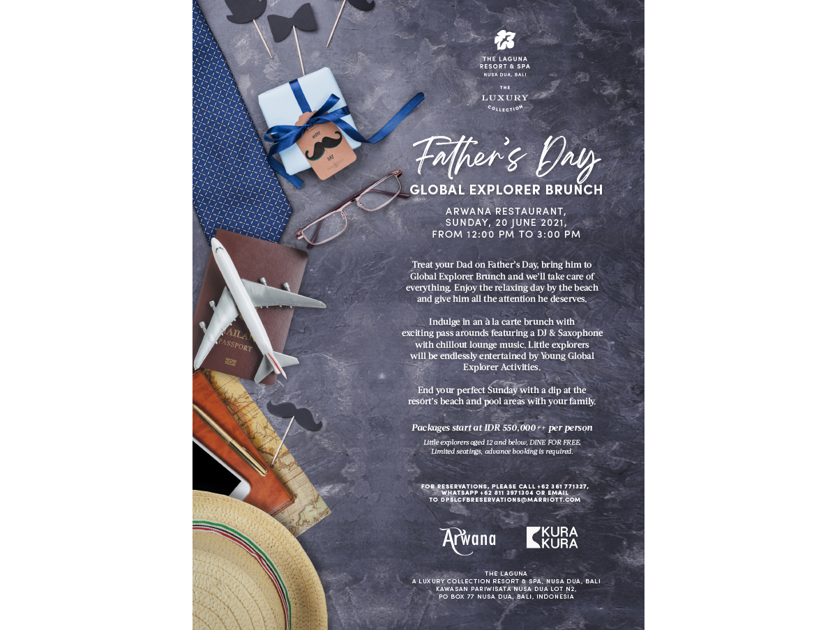 ARWANA RESTAURANT, SUNDAY, 20 JUNE 2021, FROM 12:00 PM TO 3:00 PMTreat your Dad on Father’s Day, bring him to Global Explorer Brunch and we’ll take care of everything. Enjoy the relaxing day by the beach and give him all the attention he deserves.Indulge in an à la carte brunch with exciting pass arounds featuring a DJ & Saxophone with chillout lounge music. Little explorers will be endlessly entertained by Young Global Explorer Activities. End your perfect Sunday with a dip at the resort’s beach and pool areas with your family.Packages start at IDR 550,000++ per personLittle explorers aged 12 and below, dine for free.Limited seatings, advance booking is required.FOR RESERVATIONS, PLEASE CALL +62 361 771327, WHATSAPP +62 811 3971304 OR EMAIL TO DPSLCFBRESERVATIONS@MARRIOTT.COM
