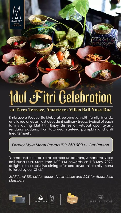 Embrace a festive Eid Mubarak celebration with family, friends, and loved ones by having culinary treats, typical of each family during Idul Fitri.Enjoy dishes of ketupat opor ayam, rendang padang, Ikan Tuturuga, sautéed pumpkin, and chili fried tempeh.Accor Plus members enjoy 20% off.Price: IDR 250,000 ++ per personOffer Validity 1 – 3 May 2022Venue Terra Terrace,Amarterra Villas Nusa Dua BaliTime 6pm – 9pmMember Benefits Accor Plus members enjoy 20% off