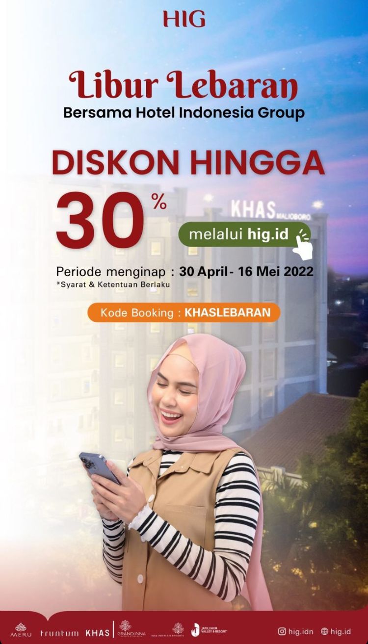 Libur Lebaran Bersama Hotel Indonesia GroupDiskon hingga 30% melalui hig.idPeriode menginap: 30 April - 16 Mei 2022*Syarat dan ketentuan berlakuKode booking: KHASLEBARAN