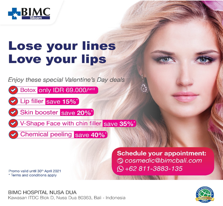 Enjoy our special Valentine’s Day deal for the new glowing of you :40% OFF on peeling treatment35% OFF on V-shape face with chin filler20% OFF on skin booster15% OFF on lip fillerBotox only IDR 69,000 per unit Terms and conditions applyPromo valid until 30th April 2021 Book your seat now at :WhatsApp : +62 811 3883 135Email : cosmedic@bimcbali.com Look 10 years younger is only a consultation away