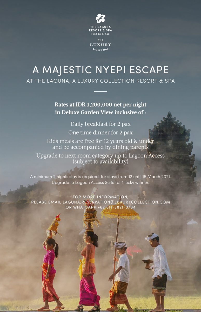 Rates at IDR 1,200,000 net per nightin Deluxe Garden View inclusive of :Daily breakfast for 2 paxOne time dinner for 2 paxKids meals are free for 12 years old & underand be accompanied by dining parentsUpgrade to next room category up to Lagoon Access(subject to availability)A minimum 2 nights stay is required, for stays from 12 until 15 March 2021.Upgrade to Lagoon Access Suite for 1 lucky winner.FOR MORE INFORMATION,PLEASE EMAIL LAGUNA.RESERVATION@LUXURYCOLLECTION.COMOR WHATSAPP +62 811-3821-3734