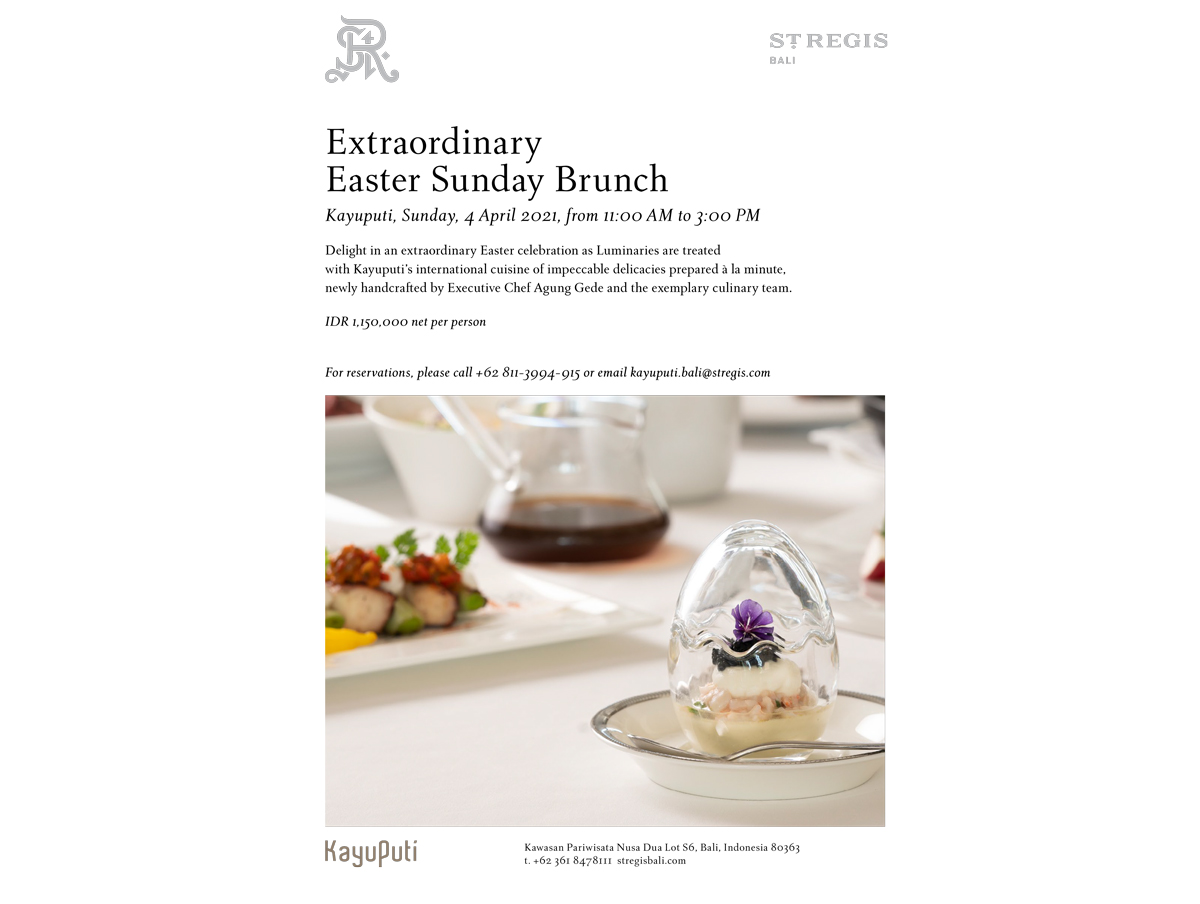 Kayuputi, Sunday, 4 April 2021, from 11:00 AM to 3:00 PMDelight in an extraordinary Easter celebration as Luminaries are treated with Kayuputi’s international cuisine of impeccable delicacies prepared à la minute, newly handcrafted by Executive Chef Agung Gede and the exemplary culinary team.IDR 1,150,000 net per person.For reservations, please call +62 811-3994-915 or email kayuputi.bali@stregis.com