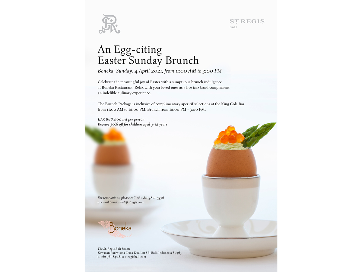 Boneka, Sunday, 4 April 2021, from 11:00 AM to 3:00 PMCelebrate the meaningful joy of Easter with a sumptuous brunch indulgence at Boneka Restaurant. Relax with your loved ones as a live jazz band complement an indelible culinary experience. The Brunch Package is inclusive of complimentary aperitif selections at the King Cole Bar from 11:00 AM to 12:00 PM. Brunch from 12:00 PM - 3:00 PM.IDR 888,000 net per person. Receive 50% off for children aged 3-12 years.For reservations, please call +62 811-3821-5356 or email boneka.bali@stregis.com