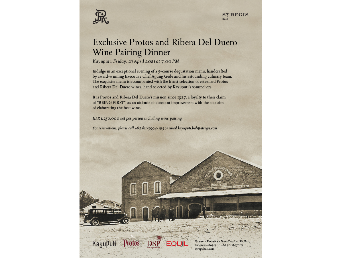 Kayuputi, Friday, 23 April 2021 at 7:00 PMIndulge in an exceptional evening of a 5-course degustation menu, handcrafted by award-winning Executive Chef Agung Gede and his astounding culinary team. The exquisite menu is accompanied with the finest selection of esteemed Protos and Ribera Del Duero wines, hand selected by Kayuputi’s sommeliers.It is Protos and Ribera Del Duero’s mission since 1927, a loyalty to their claim of “BEING FIRST”, as an attitude of constant improvement with the sole aim of elaborating the best wine.IDR 1,250,000 net per person including wine pairingFor more information and reservations, please call +62 361 8478 111, email Kayuputi.Bali@stregis.com