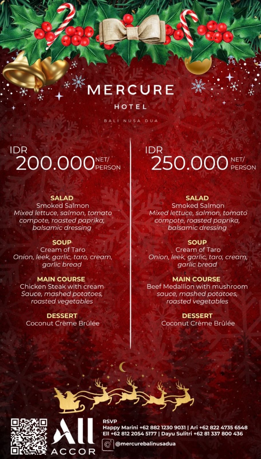 MERCURE HOTELBALI NUSA DUAIDR200.000 NET/ PERSONSALADSmoked SalmonMixed lettuce, salmon, tomato compote, roasted paprika, balsamic dressingSOUPCream of TaroOnion, leek, garlic, taro, cream, garlic breadMAIN COURSE Chicken Steak with cream Sauce, mashed potatoes, roasted vegetablesDESSERTCoconut Crème Brûlée250.000 NET/PERSONSALADSmoked SalmonMixed lettuce, salmon, tomato compote, roasted paprika, balsamic dressingSOUPCream of TaroOnion, leek, garlic, taro, cream, garlic breadMAIN COURSEBeef Medallion with mushroom sauce, mashed potatoes, roasted vegetablesDESSERTCoconut Crème BrûléeRSVPHappy Marini +62 882 1230 9031 | Ari +62 822 4735 6548 Ell +62 812 2054 5177 | Dayu Sulitri +62 81 337 800 436@mercurebalinusadua