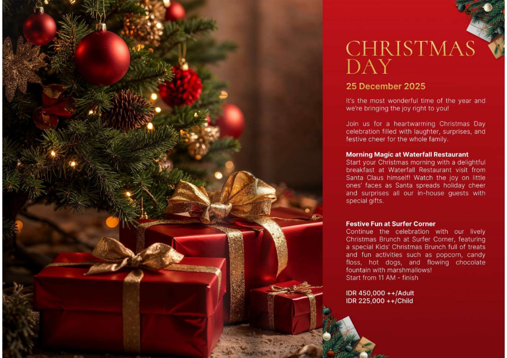 CHRISTMAS DAY25 December 2025It's the most wonderful time of the year and we're bringing the joy right to you!Join us for a heartwarming Christmas Day celebration filled with laughter, surprises, and festive cheer for the whole family.Morning Magic at Waterfall Restaurant Start your Christmas morning with a delightful breakfast at Waterfall Restaurant visit from Santa Claus himself! Watch the joy on little ones' faces as Santa spreads holiday cheer and surprises all our in-house guests with special gifts.Festive Fun at Surfer CornerContinue the celebration with our lively Christmas Brunch at Surfer Corner, featuring a special Kids' Christmas Brunch full of treats and fun activities such as popcorn, candy floss, hot dogs, and flowing chocolate fountain with marshmallows!Start from 11 AM - finishIDR 450,000 ++/AdultIDR 225,000 ++/Child